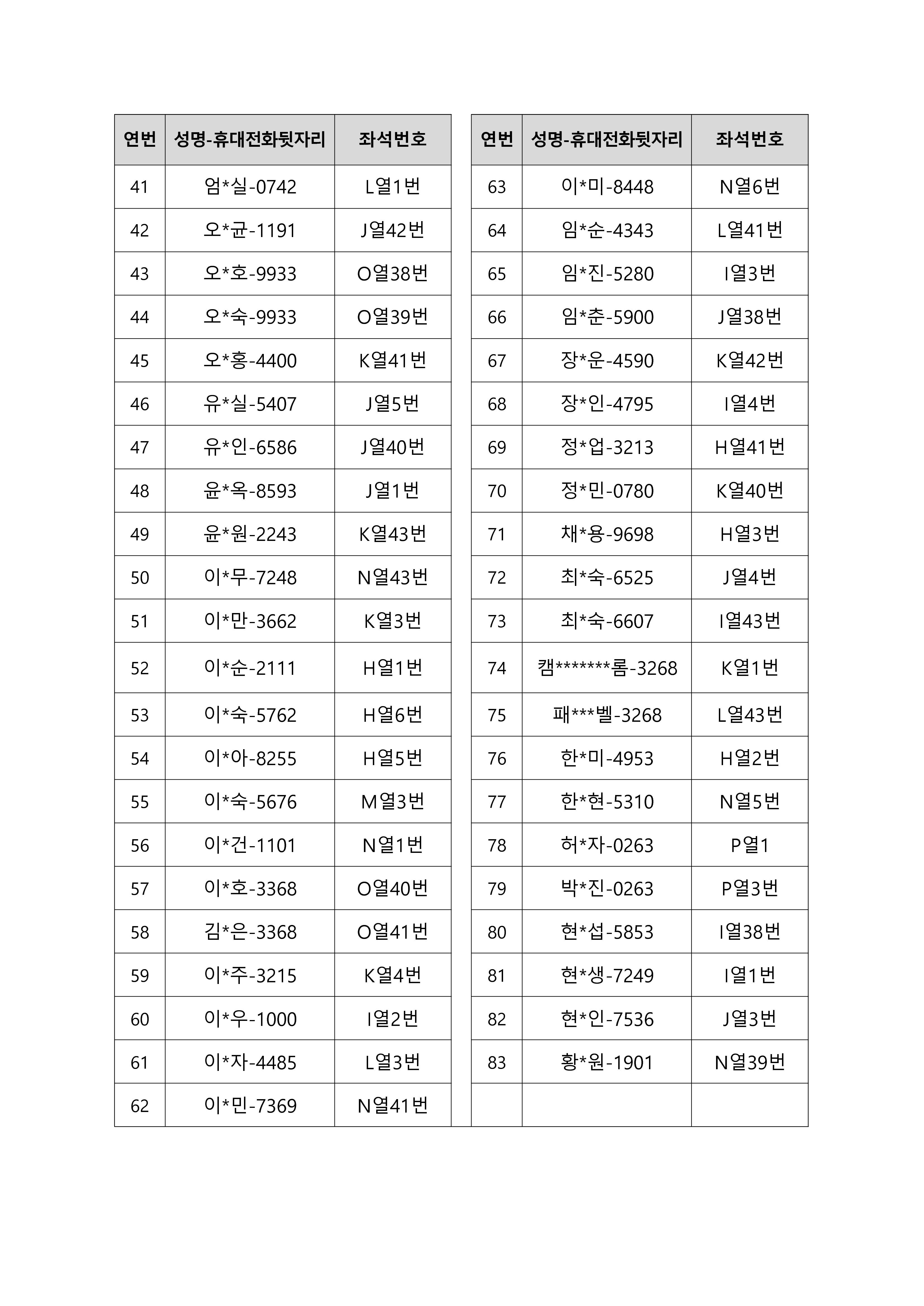 연번 | 성명-휴대전화뒷자리 | 좌석번호 |