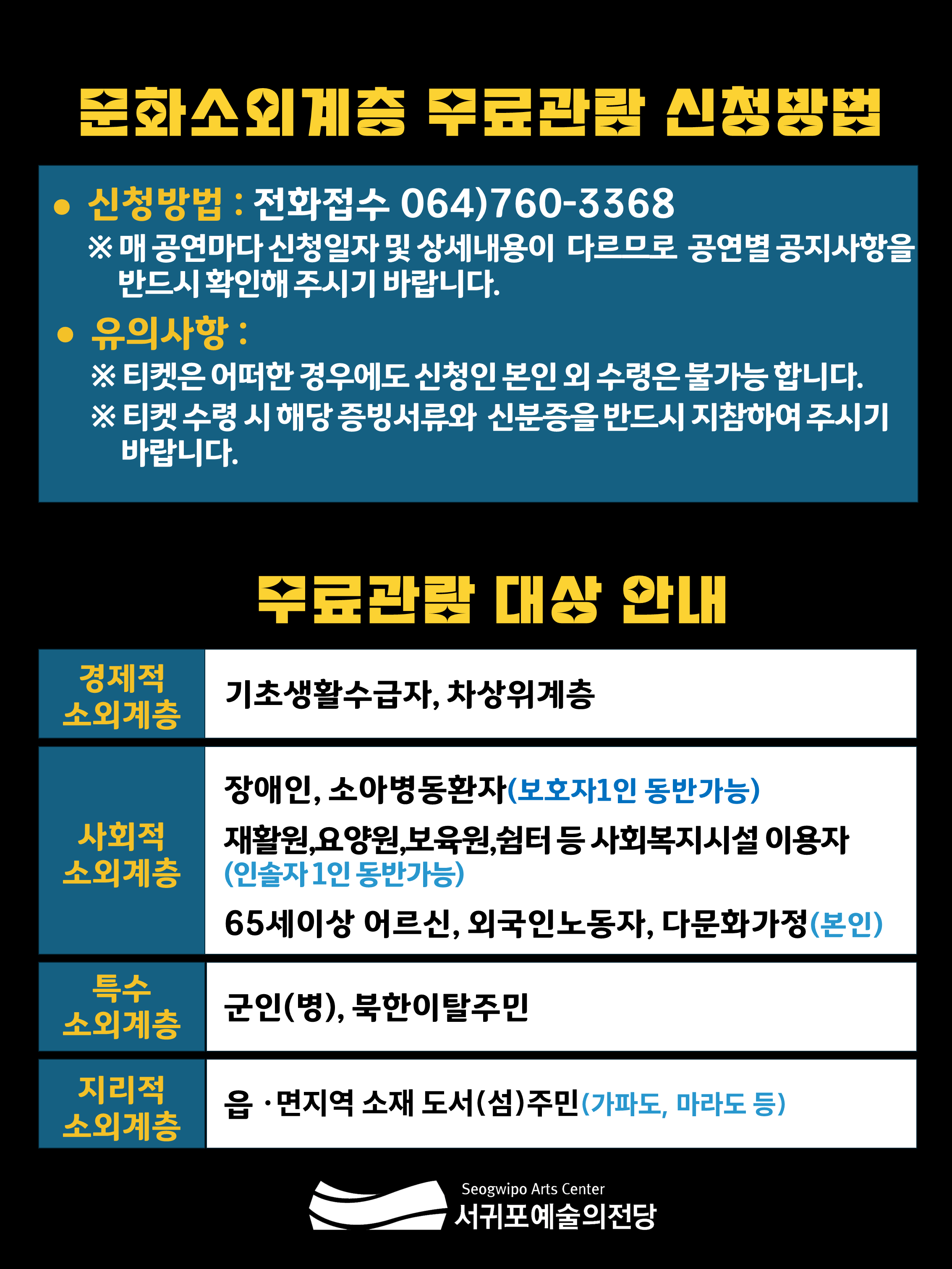 신청방법 064-760-3368 (서귀포예술의전당) 전화를 통한 예매 진행 - 매 공연마다 신청일자가 다르니, 신청 기간은 홈페이지 내 공연별 공지사항 확인 필수
