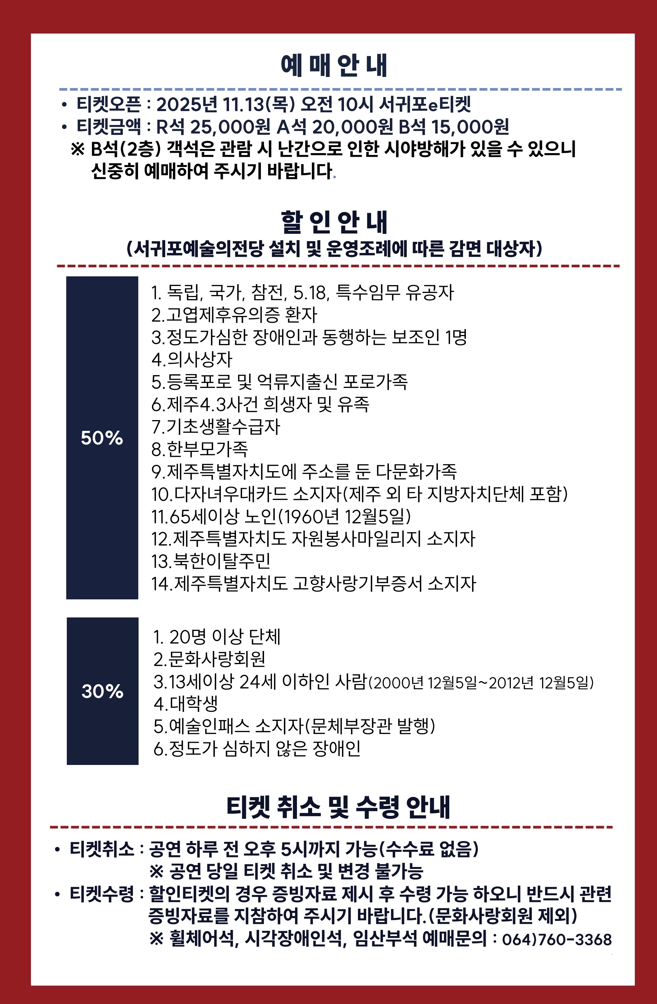 - 일반 온라인 예매: 2025년 11월 13일(목) 오전 10:00부터 서귀포 e티켓에서 가능