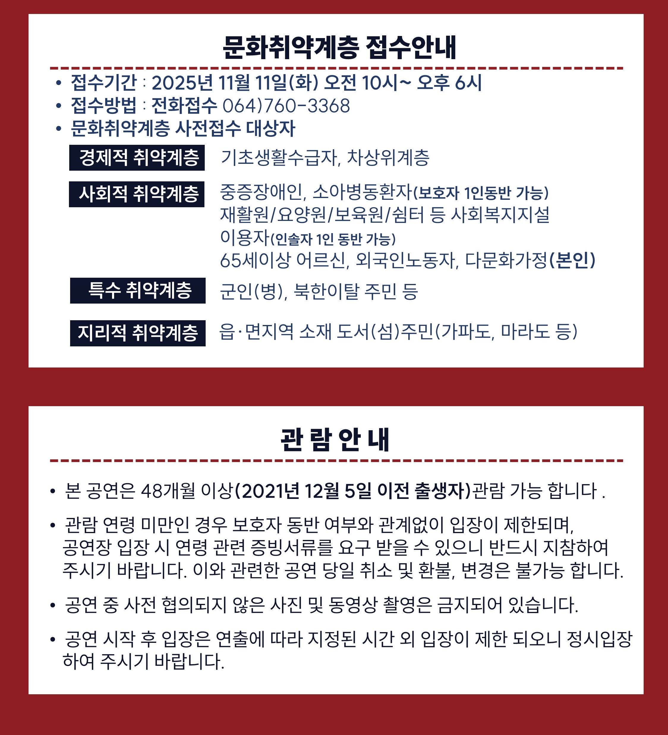 - 문화취약계층 전화접수: 2025년 11월 11일(화) 10:00~18:00