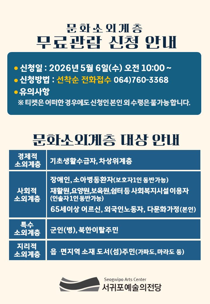 | [공지] | ★문화소외계층 무료관람 신청방법 및 대상 안내 ★ | 서귀포시 | 2024-01-08 | 6947 | |