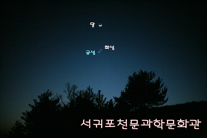 금성이 아주 밝아서 화성은 잘 안보이는데요. 금성 옆에 화성을 유심히 보시면 붉은색으로 빛납니다.