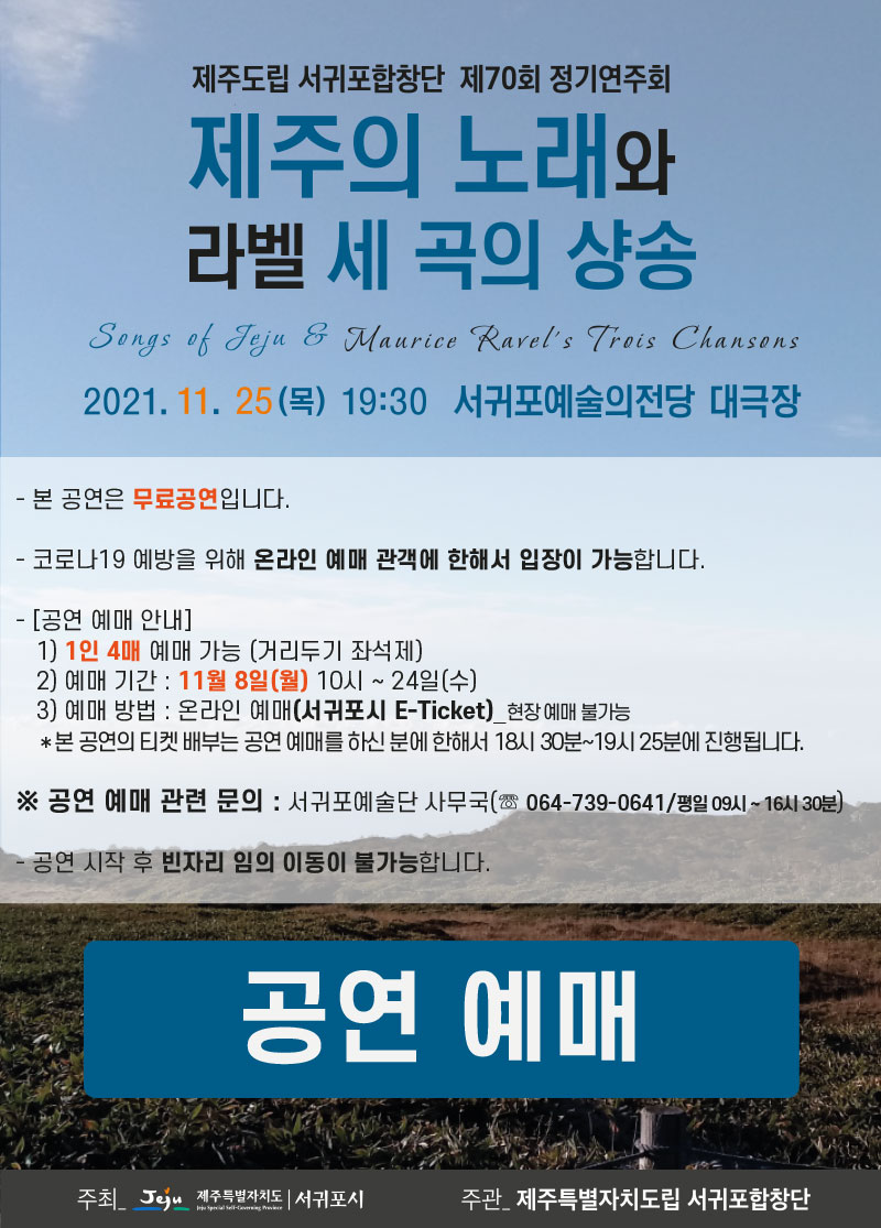 1298 | [공연] 서귀포합창단 제70회 정기연주회 예매 안내.. | 고지수 | 2021-11-03 | 6022 | |