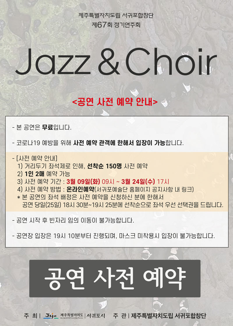 [공지] 서귀포합창단 제67회 정기연주회 사전예약 안.. | 서귀포예술단 | 2021-03-08 | 7742 | ||