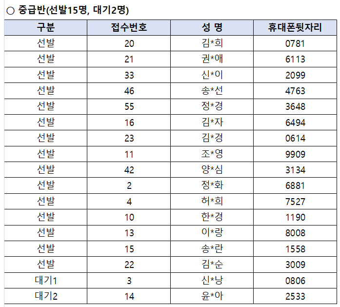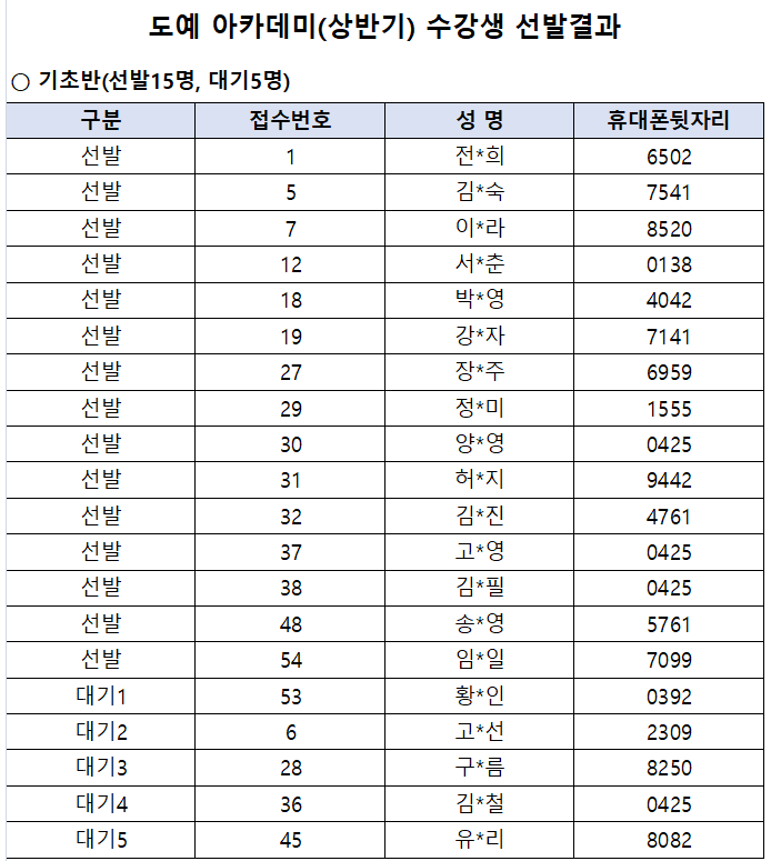 창작스튜디오 2020년 상반기 도예아카데미 수강신청자를 대상으로 한 공개추첨(금일 14시) 결과 다음과 같이 수강생 선발되었음을 알려드립니다.