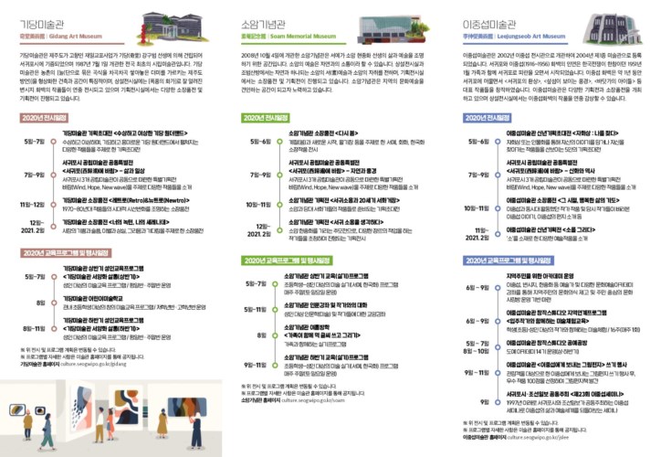 미술관 3개소의 기본적인 관람 정보는 물론 각 미술관별 전시 및 교육프로그램 일정과