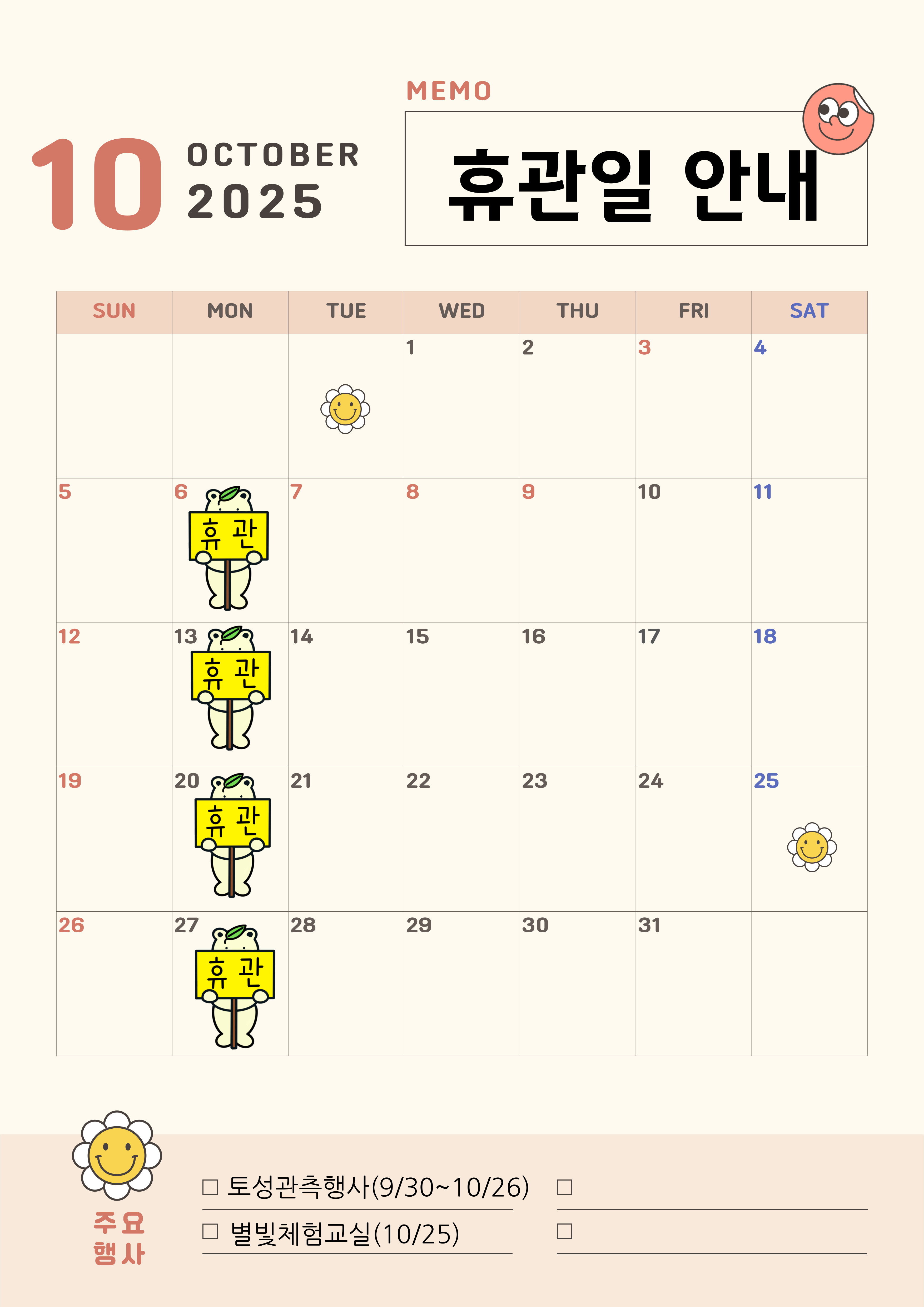 2315 | 2025년 10월 휴관일 안내 | 천문과학문화관 | 2025-09-17 | 146 | |
