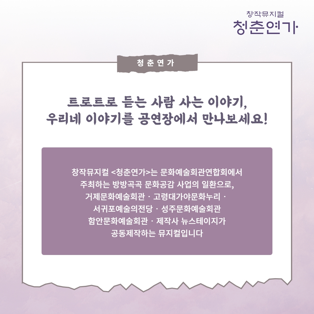 창작 뮤지컬 청춘연가 | 서귀포시 | 2023-09-27 | 11212 | ||
