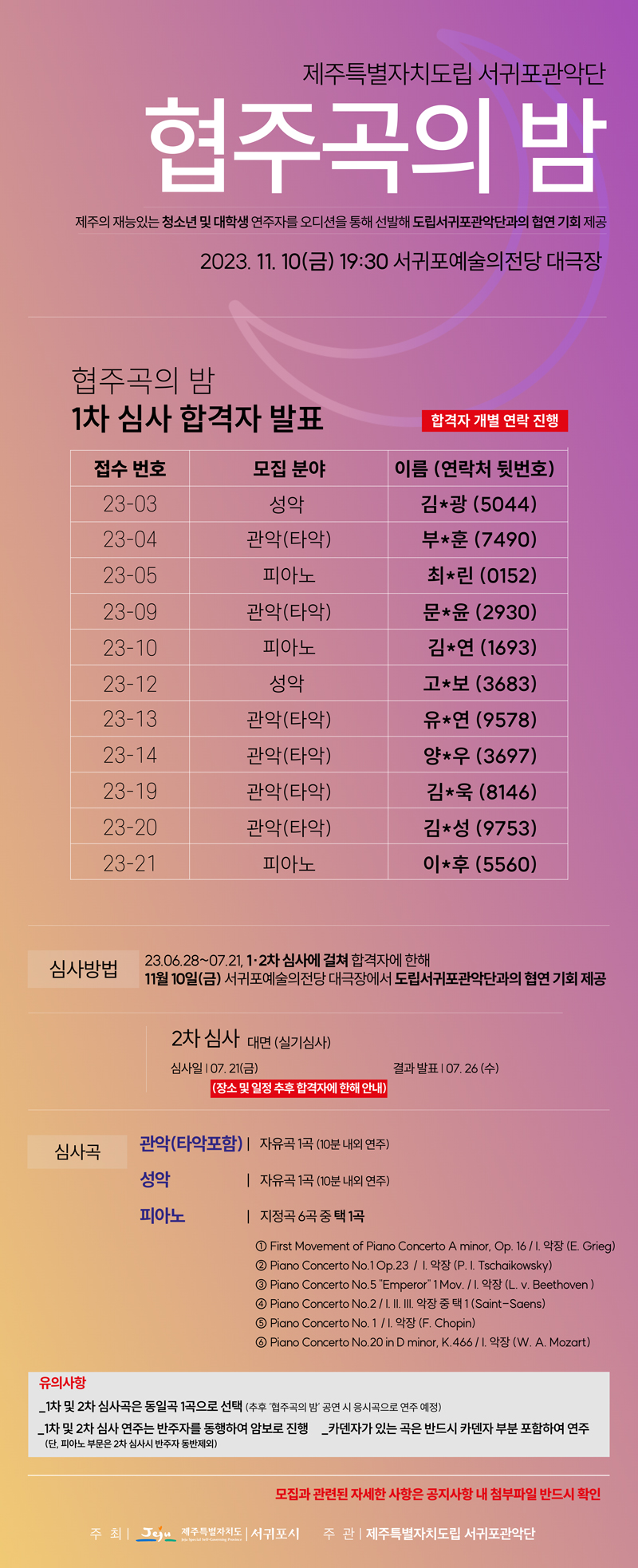 [공지] 제주도립서귀포관악단 2023 청소년 대학생 협주곡의 밤 협연자 모집 공고 1차 심사 결과 발표