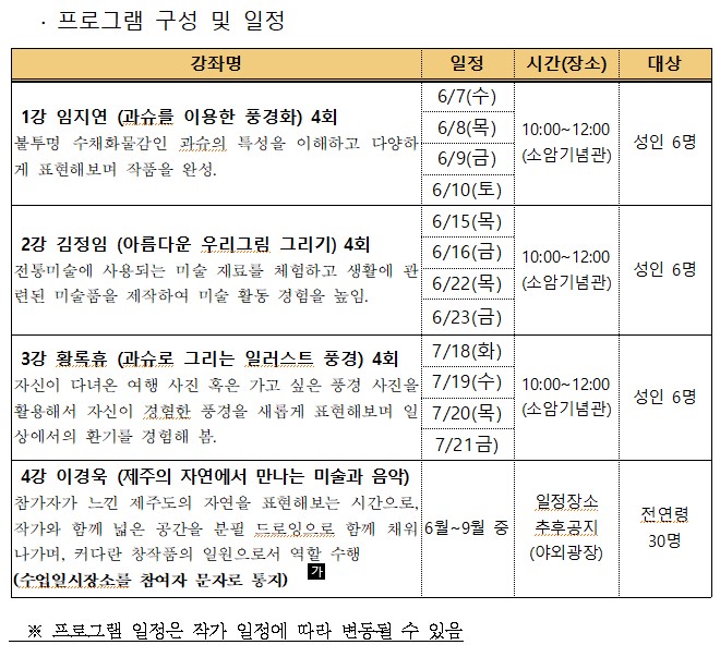 2강좌 김정임 작가(한국화)3명, 4강좌 이경욱작가(일러스트드로잉-야외)26명 체험교육 수강생은