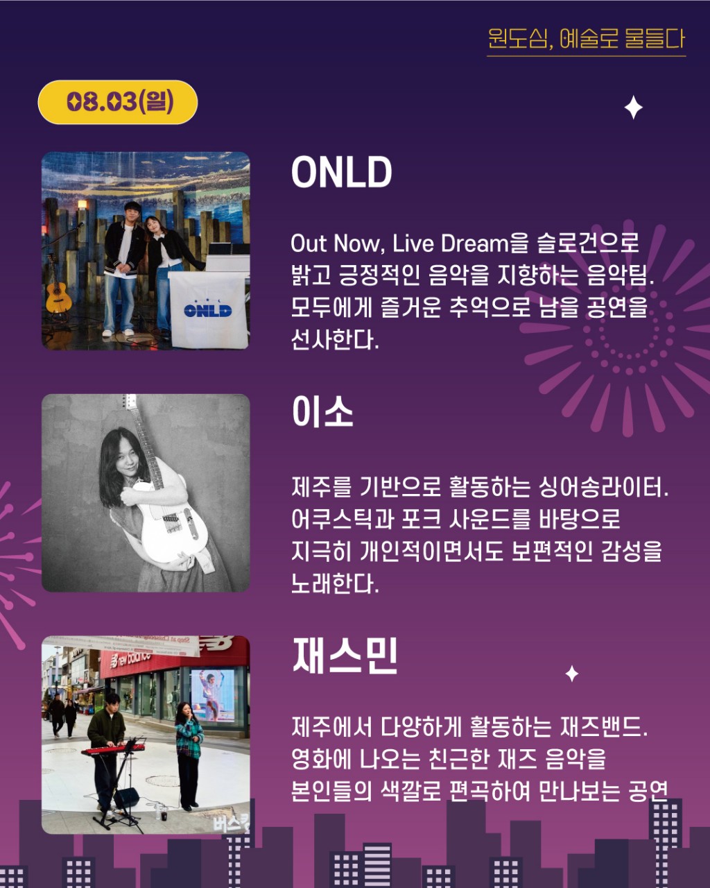 ✅ 마임, 지역 아티스트 공연, 불꽃놀이, 다양한 장르 융합 공연