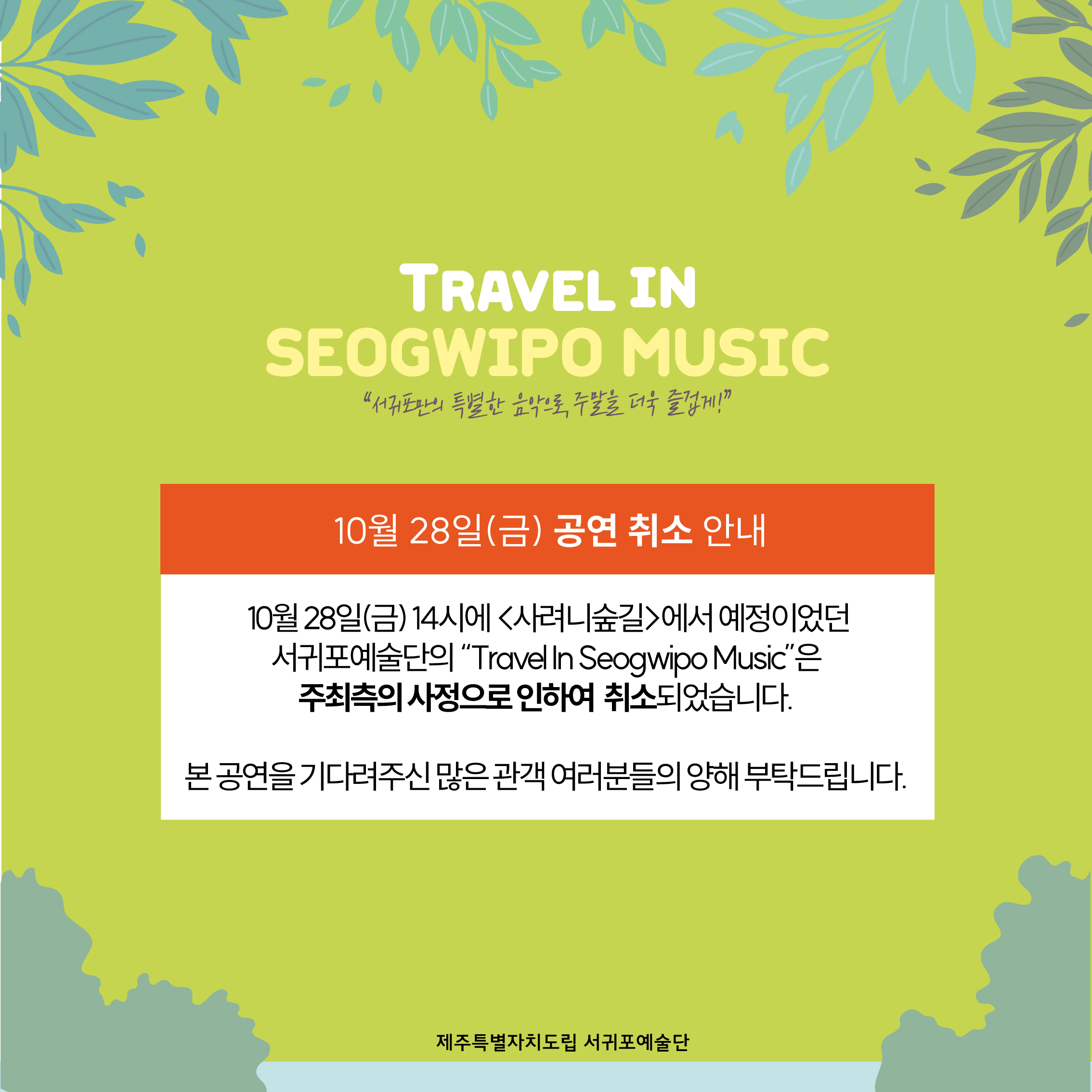 [공연] Travel in Seogwipo Music_사려니숲길 공연 취소 안내