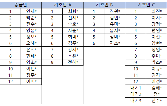 *기초반A, 기초반B는 미달로 인하여 금일 재공고 예정입니다.