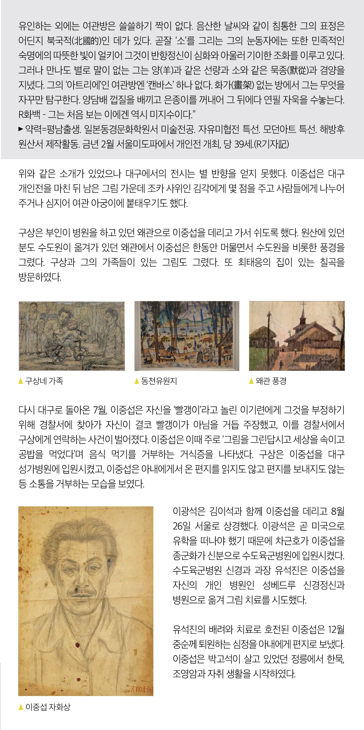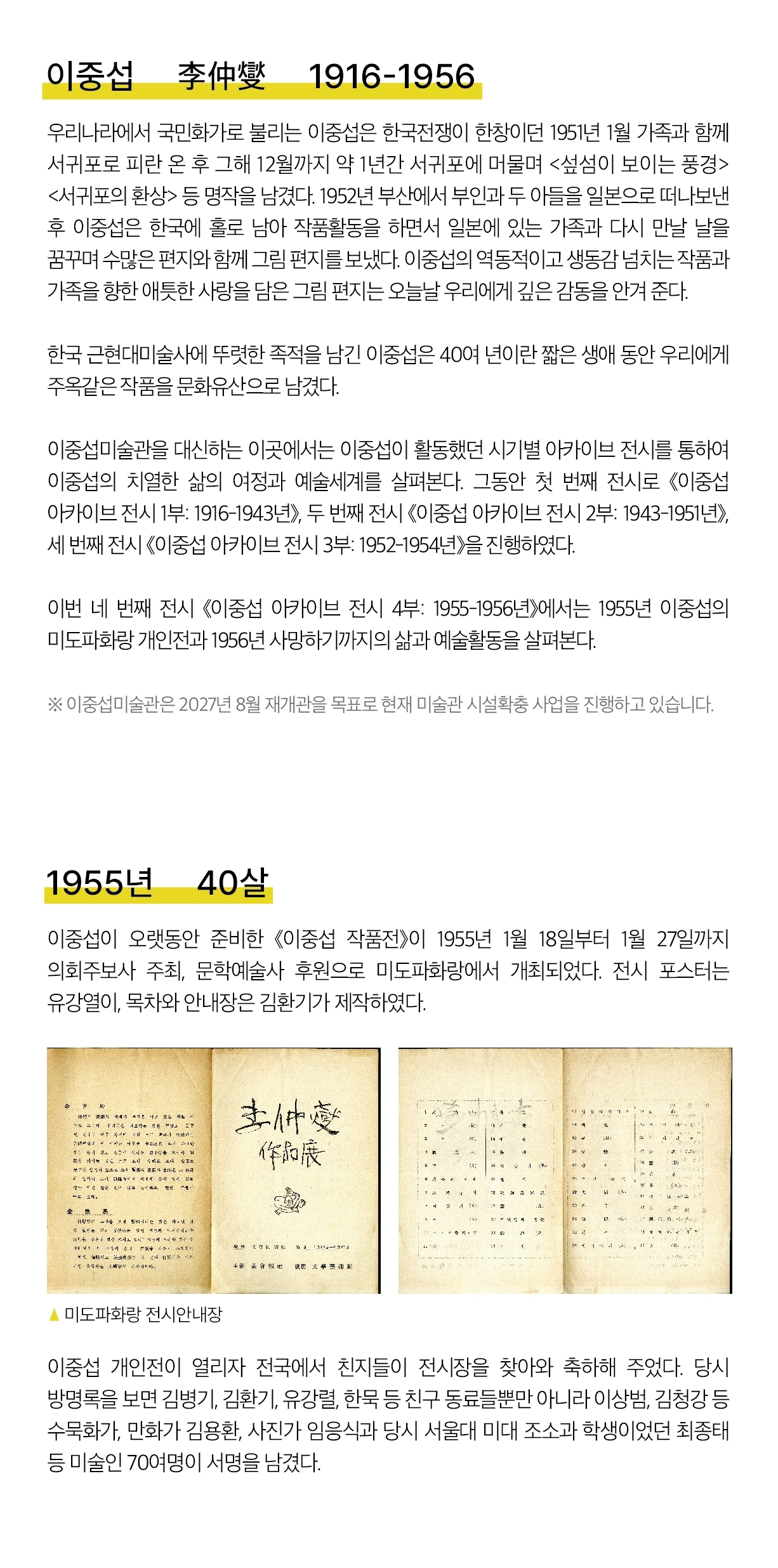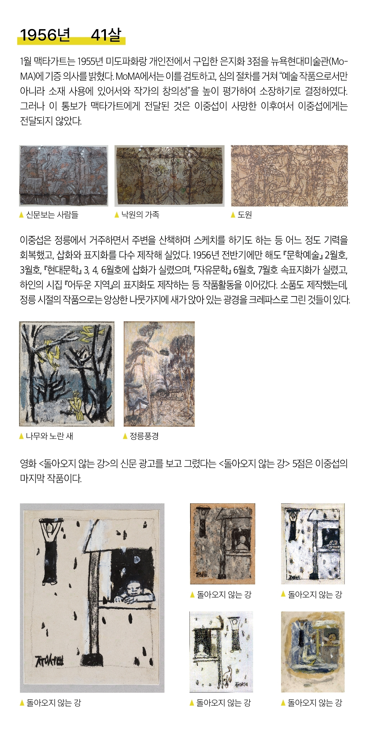 대구 전시를 끝내고 1956년 사망하기까지 이중섭의 삶과 예술 활동을 기록물로 조명한다.