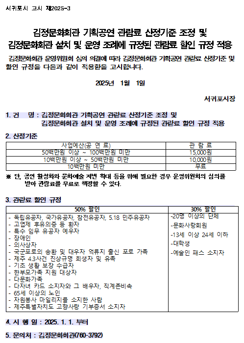 김정문화회관 기획공연 관람료 산정 기준 조정 및 할인규정 적용