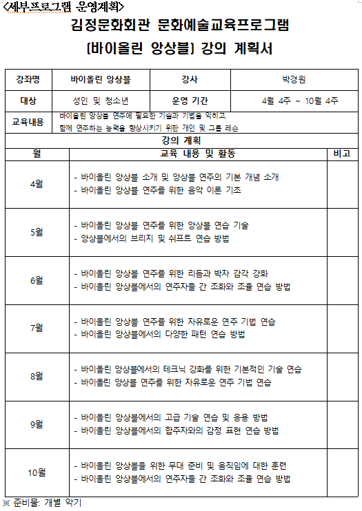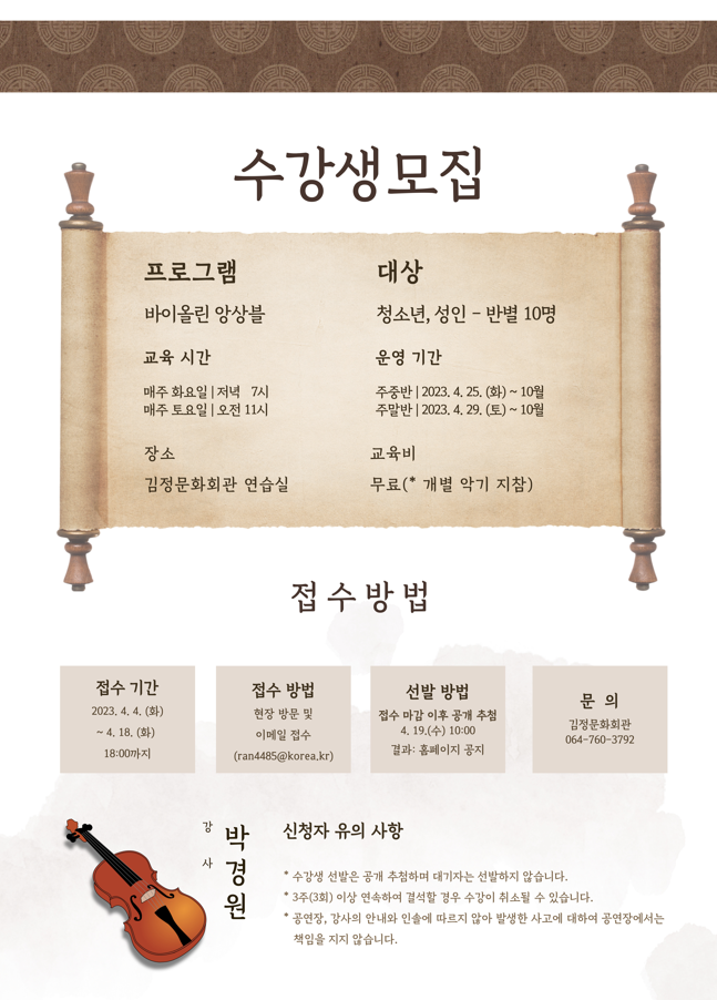 2023년 김정문화회관 문화예술 교육프로그램 바이올린 앙상블 수강생 모집