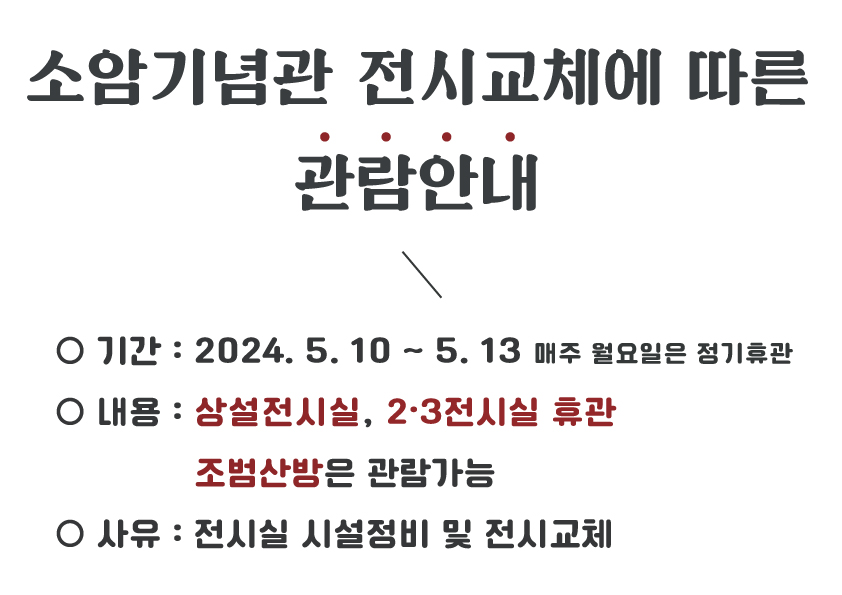 205 | 소암기념관 전시교체에 따른 관람안내.. | 소암기념관 | 2024-07-05 | 3242 | |