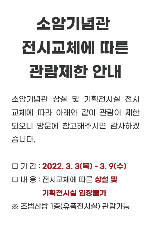 2022. 3. 3(목) ~ 3. 9(수)까지 상설전시실 및 기획전시실 입장이 불가하오니,