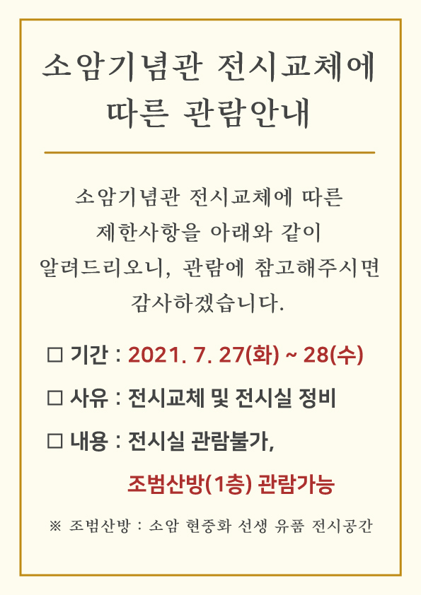 소암기념관 전시교체에 따른 관람안내.. | 소암기념관 | 2021-07-24 | 7861 | ||